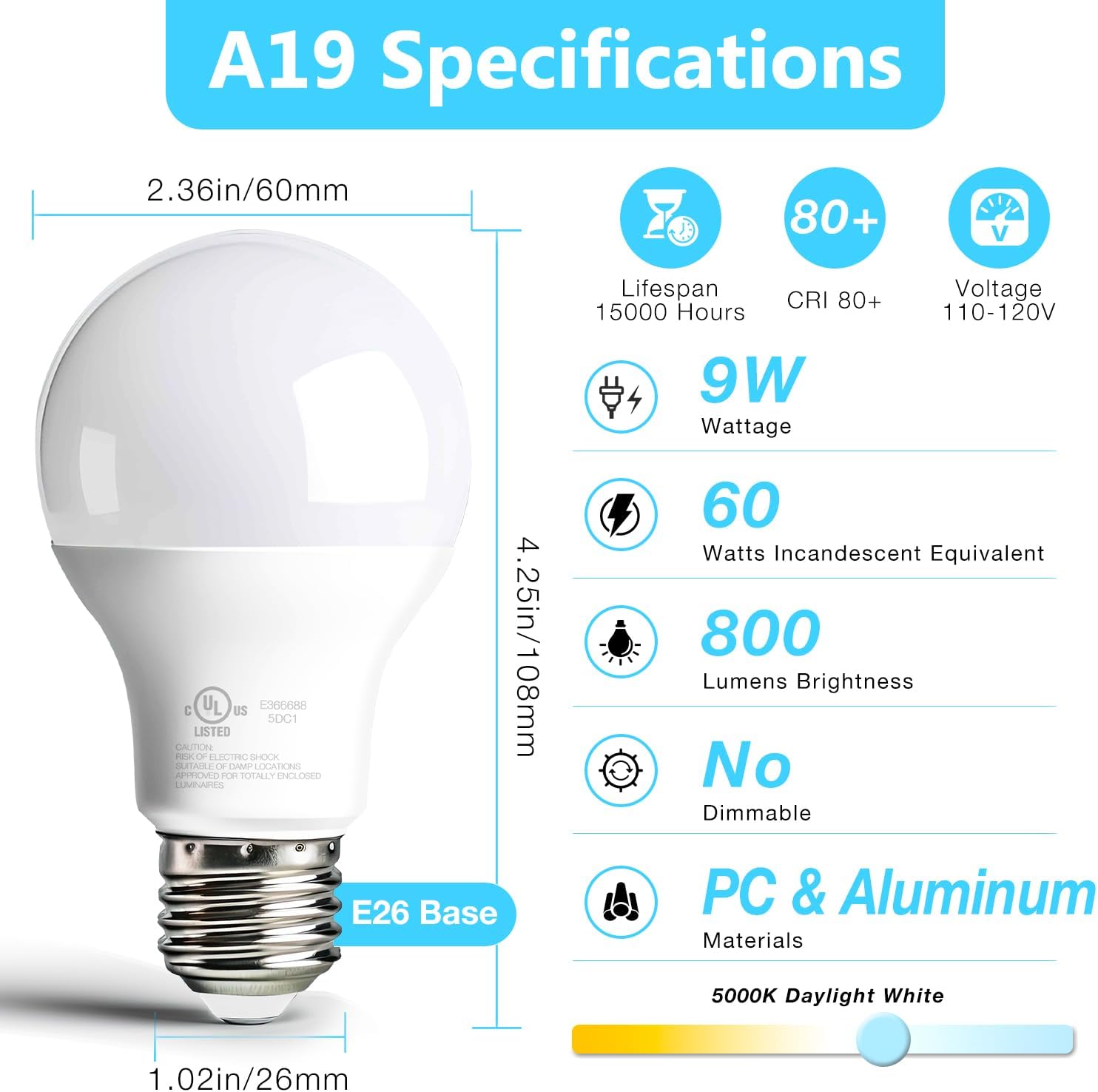 dalattin 24 Pack LED Bulbs Daylight White 5000K, 60 Watt Equivalent A19 Standard Bulbs, E26 Base, 800 LM, Efficient 9W Energy Saving, Non-Dimmable, 80+ CRI, 120V, UL Listed, for Living Room,