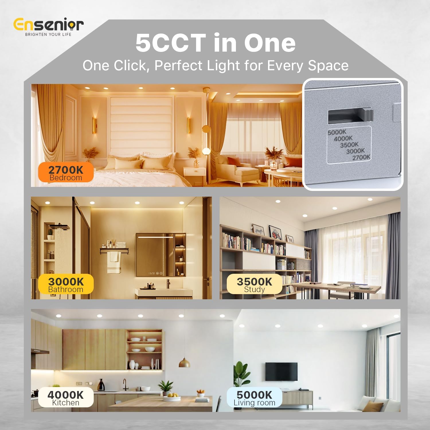 - 💡【5 Temperature Settings】Choose from 2700K, 3000K, 3500K, 4000K, 5000K with a simple click on the side of the J-box. Ensenior recessed ceiling lights can seamlessly fit into your bedroom, living room, kitchen, bathroom, workplace and other rooms.