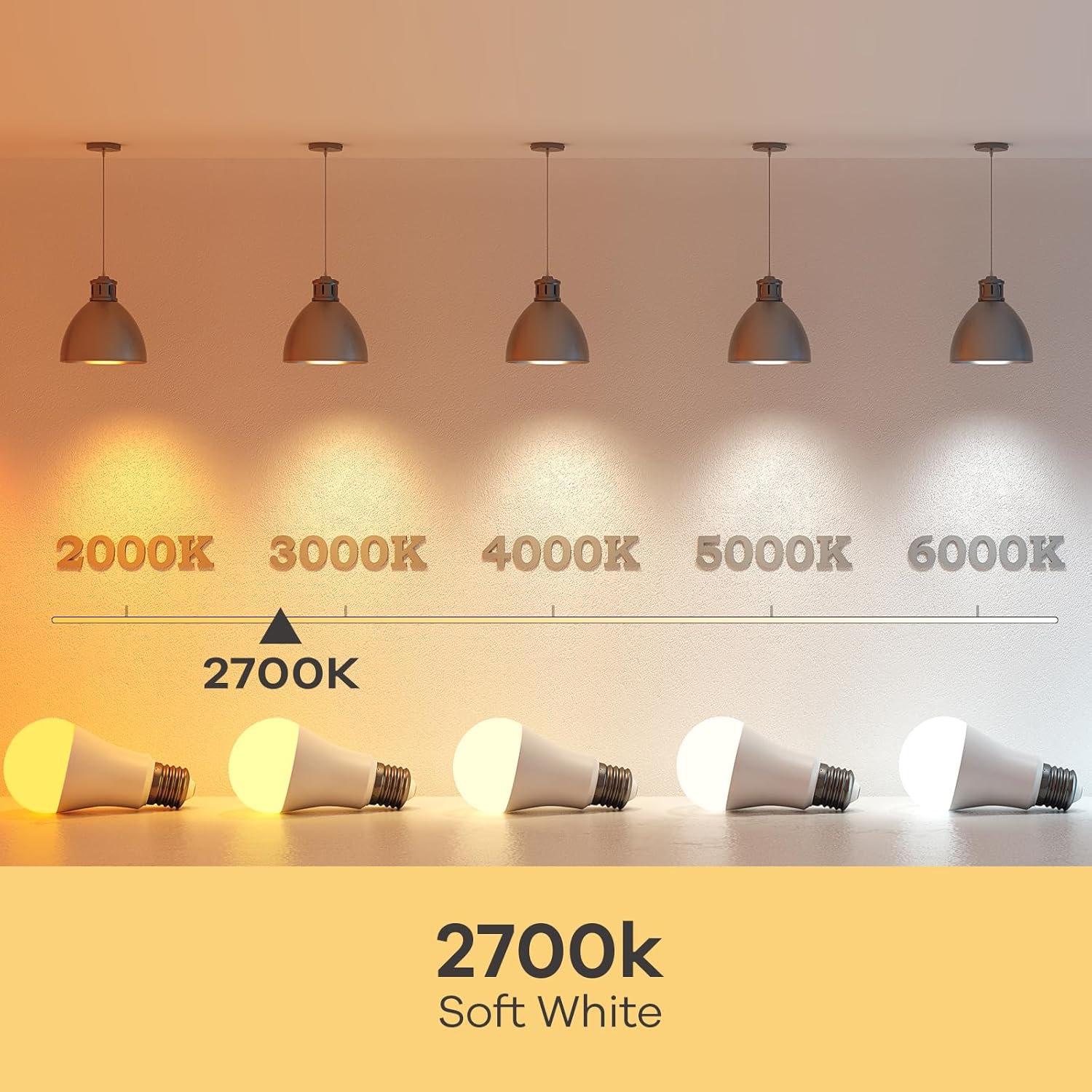 - High Brightness & CRI — The non-dimmable 60W equivalent led light bulbs emit 800 lumens of 2700K soft white light, ideal brightness for lighting up your living room, dining room, office, kitchen and anywhere which needs great lighting. With high CRI 80+, the 9W A19 led bulbs emit a vivid and natural color, creating a better visual enjoyment for your space.