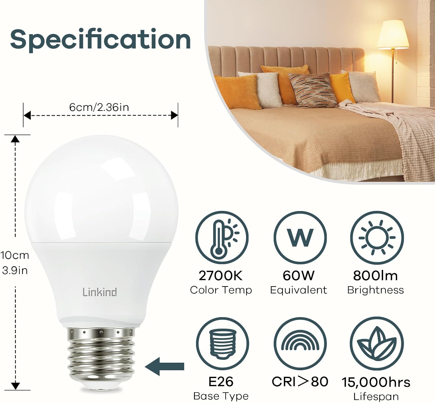 - Promised Quality & Eye Protection — These A19 light bulbs 60 watts have passed UL Listed and FCC certification to guarantee great quality. Emitting stable, non-flickering light and zero harsh glares prevent eye fatigue and protect your family\’s eyesight effectively. No UV or IR Radiation. You can use Linkind products without any worry.